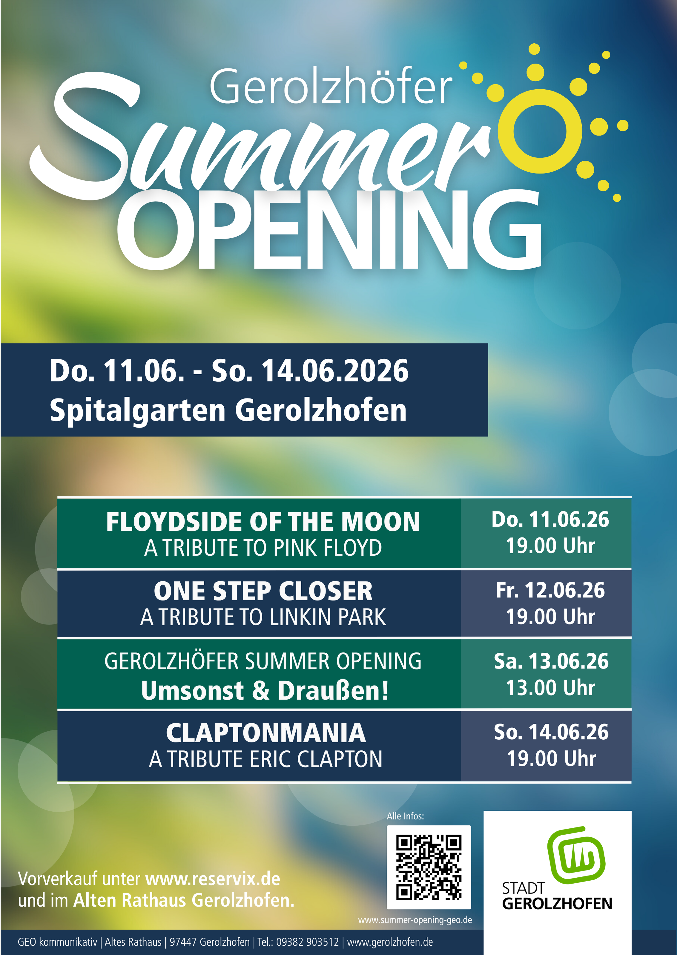 Auch 2026 bleibt sich das Festival treu: Vier Tage – vier Erlebnisse. Von internationalen Tribute-Acts über ein großes Umsonst & Draußen-Festival bis hin zum akustischen Abschlusskonzert – das Gerolzhöfer Summer Opening bietet Vielfalt und Qualität, nahbar und auf hohem Niveau.